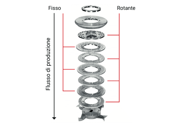 Infatti, al contrario delle convenzionali piastre forate e sistemi di taglio, il prodotto pre-miscelato, da emulsionare, è risucchiato attraverso un sistema di piastre forate e piastre di taglio in sequenza verticale. Queste ruotano senza contatto ad una minima distanza una dall’altra, evitando così frizione, contaminazione metallica e usura delle stesse.
