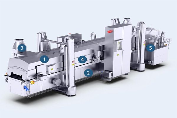 Un nastro trasportatore dirige i prodotti attraverso l’olio caldo. Il nastro è regolabile in altezza e assicura che i prodotti rimangano immersi nell’olio. Nella parte inferiore, lungo tutta l’ampiezza della friggitrice, è installato un altro nastro raschiatore che trasporta i sedimenti residui all’uscita. Vi è inoltre un filtro integrato che rimuove i sedimenti in superficie e li espelle dalla friggitrice. La circolazione interna dell’olio viene controllata per garantire un’ottimale distribuzione della temperatura e un’efficiente rimozione dei sedimenti.