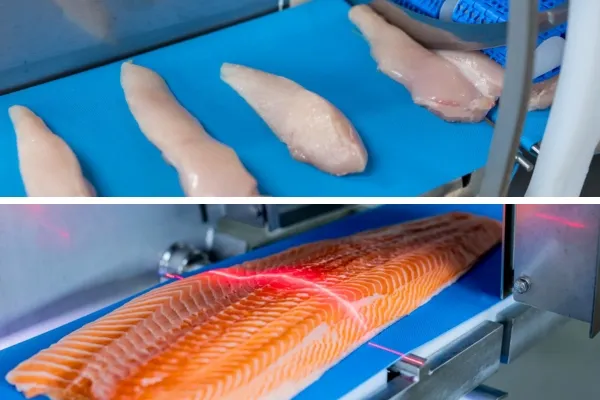 Macchine singole o Linee automatiche modulari, pensate per una produzione ad alto rendimento e ad elevata produttività di porzioni o cubetti di carne, pollo e pesce.